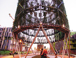 晚上,則一定要先去“生態(tài)氣候樹(shù)”。來(lái)到“氣候樹(shù)”內(nèi)部的公共廣場(chǎng),站在數(shù)百平方米的廣場(chǎng)上,你會(huì)立刻體會(huì)到炎炎夏日的“冰爽”感覺(jué)。因?yàn)檫@里運(yùn)用了先進(jìn)的環(huán)境科技手段,人造出了一個(gè)“露天空調(diào)房”。當(dāng)你欣賞演出、觀(guān)看馬德里視頻時(shí),可別忘了琢磨其中奧妙。(千鶴 蘭翔)