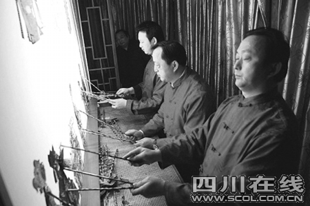 雪白的幕布上,兇猛的張飛,驍勇的關(guān)羽輪流揮刀騎馬上陣。鼓點(diǎn)越來越密,關(guān)羽與蔡陽的搏斗也越來越激烈……昨日下午,閬中嘉陵江邊,王氏兄弟正在排練川北皮影戲經(jīng)典劇目《斬蔡陽》,為參加上海世博會(huì)做準(zhǔn)備。