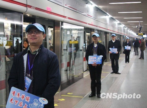 隨著世博會的臨近,上海市國資委的黨員志愿者們積極響應(yīng)市委、市政府的號召,持續(xù)深入地開展“世博先鋒行動”。日前,市國資委機關(guān)的40多名黨員志愿者們來到人民廣場地鐵一號線,他們佩戴著標(biāo)有“世博先鋒行動”的藍色識別帽,手持印有“有序等候,先下后上”的文明提示語標(biāo)牌,熱情服務(wù)乘客。圖為2月25日,志愿者們在地鐵站服務(wù)乘客。中新社發(fā) 毛昭勝 攝