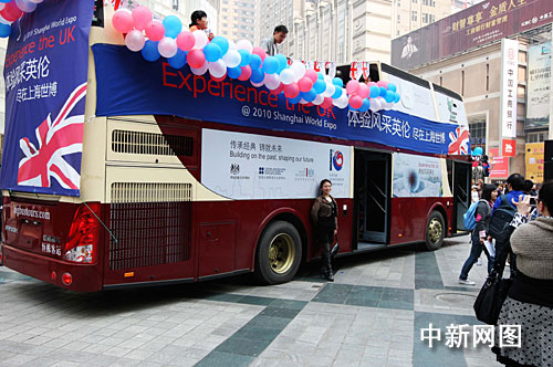 中新網(wǎng)重慶3月19日電(銀雪 郭晉嘉)19日,一輛英國(guó)傳統(tǒng)雙層大巴駛?cè)胫貞c最繁華的商貿(mào)中心解放街,宣傳上海世博會(huì)英國(guó)館及相關(guān)活動(dòng),呼吁重慶市民使用公共交通工具出行,倡導(dǎo)低碳活動(dòng)。