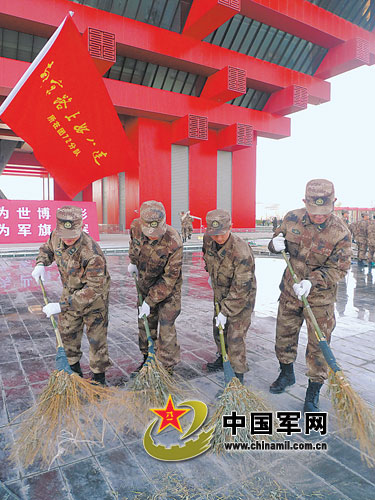 在一塊寫著“為世博添彩,為軍旗增輝”的巨型標語牌前,“南京路上好八連”的官兵拿起掃帚、鍬、鏟子等工具,緊張清理著各種建筑垃圾,他們和身后熱火朝天忙碌施工的建筑工人們一起并肩奮戰(zhàn),為世博會能圓滿開幕奉獻著自己的力量。