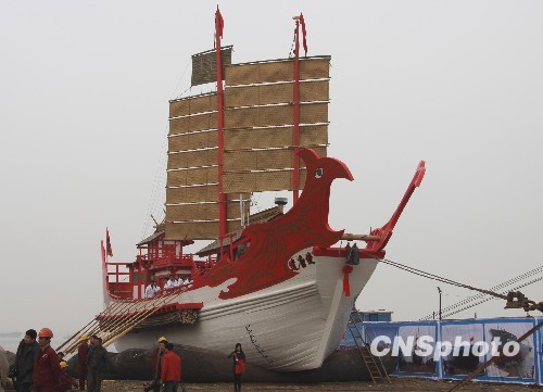 3月31日,由張家港市長明造船廠仿制的“遣唐使”船成功下水。作為中日友好文化交流的象征,該船將亮相上海世博會日本館。“遣唐使”船是以日本飛鳥時代到平安時代(公元7世紀(jì)~9世紀(jì))的遣唐使船為藍本仿制的,船長32.5米、型寬6.8米,由30多名能工巧匠花費6個半月的時間建造完工,以1:1比例還原了當(dāng)年遣唐使船的大小和結(jié)構(gòu)。中新社發(fā) 朱曉穎 攝