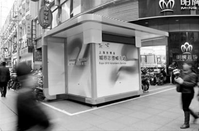記者所見(jiàn)的這個(gè)“七彩之心”站亭,屬于外建站,地處徐匯區(qū)商業(yè)街“永新坊”,不過(guò)7平方米,主要材料為耐高溫、耐潮濕、耐風(fēng)雨的彩鋼板。外形四四方方,看上去,與東方書(shū)報(bào)亭差不多大小,主色調(diào)為白色,四周邊沿則以七色裝飾,如彩帶縈繞。正面卷簾門(mén)板上,印著志愿者標(biāo)志——七彩的志愿者之“心”,“上海世博會(huì)城市志愿服務(wù)站”幾個(gè)大字十分醒目。左、右兩側(cè)的門(mén)板上,同樣繪有世博會(huì)標(biāo)志和志愿者標(biāo)志,以及世博會(huì)志愿者口號(hào):“世界在你眼前,我們?cè)谀闵磉叀。在站亭的正上方,有一條LED滾動(dòng)顯示屏,滾動(dòng)著“城市,讓生活更美好”等宣傳標(biāo)語(yǔ)。