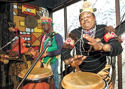 餐廳內(nèi)用非洲圖騰繪制成彩色墻面,由鴕鳥蛋做成精致吊燈,樹枝和草帽拼接裝飾屋頂,頗具非洲原生態(tài)氛圍。餐廳二樓設有一個小舞臺,就餐時,身著非洲傳統(tǒng)民族服飾的非洲團隊還會在舞臺表演。(鐘怡 徐蒙)
