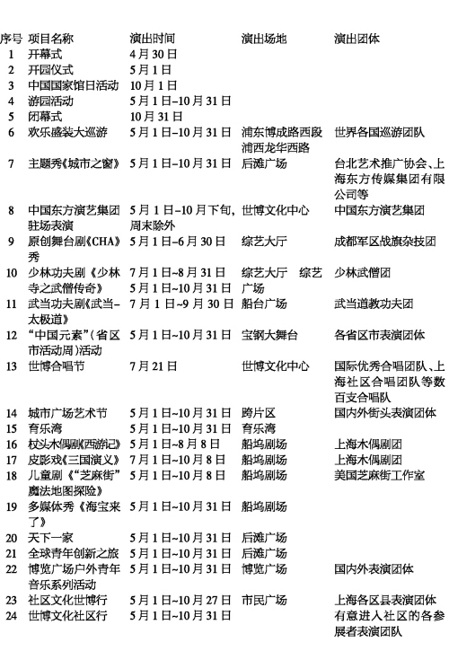 上海世博會(huì)期間,世界各地表演團(tuán)體將帶來2萬(wàn)多場(chǎng)文藝演出和活動(dòng)。由東道主組織的19項(xiàng)盛大演出也已準(zhǔn)備就緒,開幕第一天起陸續(xù)在世博園全新的文化中心、綜藝大廳、綜藝廣場(chǎng)、后灘廣場(chǎng)、船臺(tái)廣場(chǎng)、寶鋼大舞臺(tái)、育樂灣、船塢劇場(chǎng)、博覽廣場(chǎng)、市民廣場(chǎng)一一亮相,生動(dòng)演繹各國(guó)傳統(tǒng)和文化,盛情邀請(qǐng)各國(guó)來賓分享和互動(dòng)——