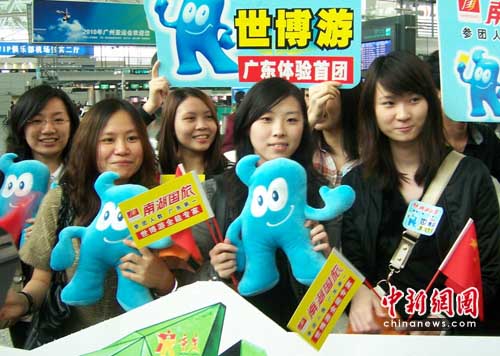中新網(wǎng)廣州4月19日電 (記者 莫非 通訊員 林月明)4月19日中午,白云機(jī)場(chǎng)國內(nèi)出發(fā)廳人氣爆棚,數(shù)十名廣東游客首嘗世博游“頭啖湯”,成為廣東進(jìn)入世博會(huì)游覽的第一批游客。