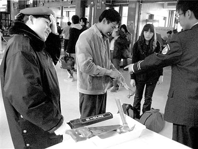 記者昨天(21日)獲悉,為確保上海世博會(huì)安全,北京鐵路警方根據(jù)鐵道部、公安部日前聯(lián)合發(fā)出的通知,從即日起至11月15日,將對(duì)登車(chē)旅客隨身攜帶的物品以及通過(guò)鐵路托運(yùn)的行包進(jìn)行特別安檢。據(jù)了解,旅客不得隨身攜帶上車(chē)的物品除了管制刀具以外,餐刀、大型水果刀、剪刀、錘子等利器和鈍器也在禁帶之列。