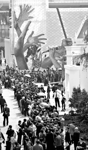 拿到中國(guó)館預(yù)約券的游客欣喜,沒拿到的也十分平和。錢先生夫婦9時(shí)45分入園時(shí),中國(guó)館預(yù)約券已發(fā)放完畢,他們就在亞洲廣場(chǎng)上的預(yù)約機(jī)上預(yù)約了主題館的參觀。“中國(guó)館反正是永久性建筑,以后再來看也不遲,”同樣未能拿到預(yù)約券的李先生告訴記者。
