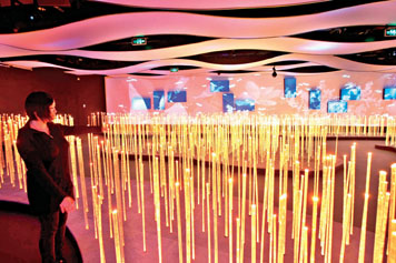 該館整體LED燈管約有11萬米,能夠形成三維的顯示矩陣。從5月1日開始,每天晚上閉館之前,將有這樣一個(gè)8分鐘左右的秀。經(jīng)歷一個(gè)“魔方”蘇醒的過程,觀眾會(huì)聽到“魔方”的“心跳”,當(dāng)“讓我們蕩起雙槳”音樂片段配合著企業(yè)聯(lián)合館的三維畫面,過去的片段在腦海中浮現(xiàn)。