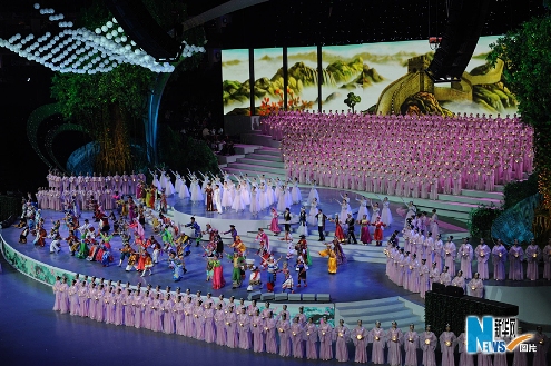 隨后,中國(guó)香港著名影星、上海世博會(huì)形象大使成龍也出現(xiàn)在舞臺(tái)上,與宋祖英一起演唱《和諧歡歌》,同時(shí)中國(guó)56個(gè)民族的舞者,也踏著慶典舞步,以中華民族共同的熱情,層層出現(xiàn)在舞臺(tái)上翩翩起舞,歡迎世界各地賓客的到來(lái)。