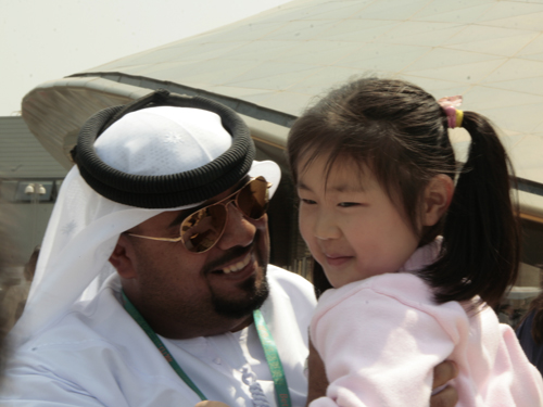 為了緩等待人群的焦急,阿聯(lián)酋館的工作人員還和游客互動,抱起了人群中的一個小女孩合照,讓周圍游客開懷不已。