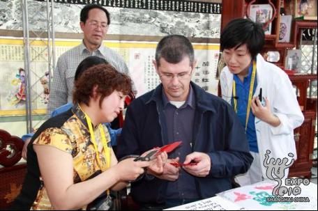 除制瓷以外,參觀寶鋼大舞臺的外國游客還常常熱衷于剪紙、織錦、皮影、旗袍等中國傳統(tǒng)文化,常常盯著一件作品看上老半天,如果碰巧遇上創(chuàng)作演示,更是不看到成品不罷休。每逢這時,獻藝的各位工藝大師總是會熱情地邀請他們親自試一試,剪下一朵花,或畫下一尾魚,體驗中國文化的奇妙。大師們頗有心得地說,語言不是障礙,微笑就是最好的溝通。