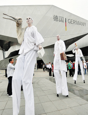 素來(lái)以穩(wěn)重、嚴(yán)謹(jǐn)著稱(chēng)的德國(guó)人把一座“懸浮在空中的建筑”帶到了上海世博園區(qū),但當(dāng)看上去不穩(wěn)的德國(guó)館建筑單體構(gòu)成一個(gè)平穩(wěn)的整體時(shí),卻強(qiáng)烈地表現(xiàn)出“和諧都市”的主題。今天上午,德國(guó)館迎來(lái)國(guó)家館日。德國(guó)館日的活動(dòng)精彩紛呈。中午時(shí)分,在世博軸陽(yáng)光谷,歐洲青年交響樂(lè)團(tuán)精彩的演奏以及德國(guó)嘻哈樂(lè)隊(duì)的節(jié)奏音樂(lè)口技和嘻哈表演輪番上場(chǎng),德國(guó)樂(lè)隊(duì)“兩居室”則為觀眾帶來(lái)最新流行樂(lè)曲。而在德國(guó)館外排隊(duì)等候的人群中,扮相奇特的“巨人”不時(shí)與游客打個(gè)招呼,帶來(lái)陣陣笑聲。