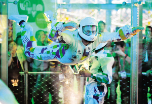 在展館樓上,有一個8米高的“玻璃房子”,一鼓風(fēng),玻璃房內(nèi)的人可以飛起來,風(fēng)洞的風(fēng)速可以在瞬間達(dá)到20公里/小時(shí),穩(wěn)穩(wěn)托舉住“飛人”。在昨天開館儀式后,拉脫維亞總理東布羅夫斯基斯身穿“飛翔服”,戴上頭盔,親身體驗(yàn)了一回當(dāng)空中飛人的感覺,將現(xiàn)場氣氛推向高潮。