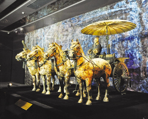 秦俑館銅車馬共兩乘,此次在中國館展出的“一號(hào)銅車馬”為雙輪、單轅、駟馬系駕,總重約1061公斤。主體為青銅所鑄,通體飾有精美彩繪,配有1000多件金銀配飾!耙惶(hào)銅車馬”在中國館“國之瑰寶”展區(qū)展出,展示將持續(xù)到世博會(huì)閉幕。