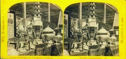 其中1862年倫敦世博會(huì)中國(guó)館立體照片,是迄今為止發(fā)現(xiàn)的世博會(huì)上有關(guān)中國(guó)館的最早的原版照片,彌足珍貴。照片由兩張一模一樣的正方形泛黃蛋白照組成。每張大小約在10厘米。底下一行英文小字顯示,照片由當(dāng)年的倫敦立體攝影公司制作完成。
