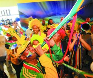 雖然開幕式要到20∶00才開始,但在19∶00不到的時候,南非館的門口和館內(nèi)就已經(jīng)喧鬧無比,受邀參加南非館世界杯開幕慶典的嘉賓,幾乎人手一個VUVUZELA,頭戴“馬卡若卡”(一種南非特色帽子,外觀像足球)。南非球迷的脖子上還掛著印有南非國旗的圍巾,臉上或手臂上也彩繪著南非國旗。