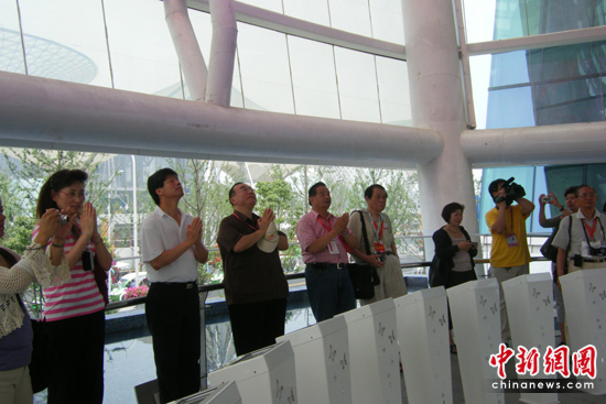 僑界人士隨后在臺(tái)灣館內(nèi)的LED點(diǎn)燈水臺(tái)共同祈福,希望中華民族能夠團(tuán)結(jié)和睦,人民生活安定。
