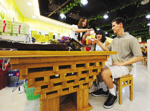 來自美國休斯敦的青年蓋瑞,攜女友一起進(jìn)入世博園區(qū)的世博文化中心后,被一股清香甘醇的茶香所吸引,一腳踏進(jìn)了設(shè)在這里的帝芙特國際茶文化園內(nèi)!爸袊杩诟姓婧茫b造型也很時(shí)尚,我很喜歡!痹谄穱L了天臺(tái)山云霧茶等幾款茶水后,蓋瑞表示要把上海茶帶回美國,讓家人和朋友分享!