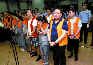 胡毅(前排右一)等18名被告人被帶上法庭。昨日,騙取北京農(nóng)商行7.08億貸款的嫌疑人庭上受審。本報(bào)記者 王貴彬 攝