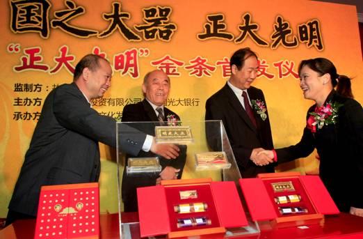 本月19日,由故宮博物院、中鈔國鼎投資有限公司、北京恒美瑞文化發(fā)展有限公司和中國光大銀行共同推出的收藏金條——“正大光明”金條首發(fā)儀式在故宮隆重舉行。故宮博物院副院長李文儒、中鈔國鼎投資有限公司總經理郭清波、中國光大銀行副行長李子卿、北京恒美瑞文化發(fā)展有限公司董事長鄭芮等領導親臨發(fā)布會現場并發(fā)表了講話。