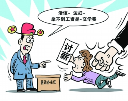 27日,因東莞市東城區(qū)“藏寶國際大酒店”拖欠裝修工人工資,工人拉橫幅上街討薪,兩工人被不明身份的黑衣人毆打。28日,東城區(qū)政府信訪辦就此舉行協(xié)調(diào)會,會上工人提及被打一事,主持會議的信訪辦主任葉柱權(quán)說是“活該”,他情緒激動,拍桌子罵女工人為“潑婦”,稱工人拿不到工資是“交學(xué)費(fèi)”。(相關(guān)報道見今日A14版)