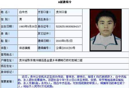 簡(jiǎn)介:今年8月2日,公安部發(fā)布A級(jí)通緝令,懸賞5萬元緝拿在逃犯罪嫌疑人白中杰,他涉嫌參與一個(gè)搶劫、殺人團(tuán)伙。該團(tuán)伙自今年7月12日以來,在貴陽、安順、畢節(jié)等地連續(xù)實(shí)施搶劫、殺人作案6起,殺死9人。在公安部網(wǎng)站上自2006年1月26日以來公布的25個(gè)A級(jí)通緝令通緝的犯罪嫌疑人中,白中杰是年齡最小的,是唯一的“90后”。8月4日白中杰被警方抓獲。