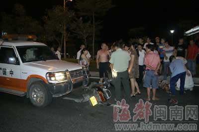 事發(fā)8月17日晚近10時(shí),黃先生說(shuō):“太突然了,我一下被撞飛,當(dāng)時(shí)馬上暈過(guò)去了!碑(dāng)晚,他和幾個(gè)同事在江濱路大排檔吃完飯后,分乘兩輛摩托車沿江濱路由東往西行駛,他開(kāi)的摩托車上載著同事周女士。途經(jīng)洋老洲游泳池附近時(shí),黃先生突然感到后面有車撞來(lái),他和周女士被撞倒并被往前面推行了10多米,接著他就暈過(guò)去了。