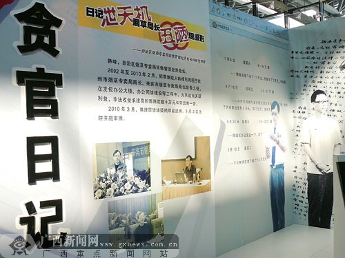 展廳中引人矚目的,是曾“名噪一時(shí)”的自治區(qū)煙草專(zhuān)賣(mài)局原銷(xiāo)售處處長(zhǎng)、來(lái)賓市煙草專(zhuān)賣(mài)局原局長(zhǎng)韓峰。“日記局長(zhǎng)”也進(jìn)入展覽,引來(lái)眾人圍觀。