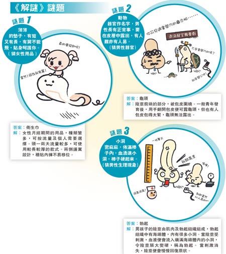 負(fù)責(zé)策劃《解謎》的家計(jì)會(huì)教育干事陳耀杰表示,《解謎》的版面設(shè)計(jì)十分可愛,從封面到內(nèi)頁都輔以不少生動(dòng)的漫畫,希望吸引小朋友閱讀,該書采一問一答形式,方便家長(zhǎng)和教師與小朋友打開話題,輕松無尷尬地談性,“家長(zhǎng)可先猜猜謎,由謎語游戲開始,玩一會(huì)才向子女灌輸性教育”。