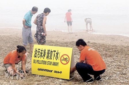 環(huán)保組織綠色和平昨日指出,受漏油意外污染的大連一帶海域,黑色油污已漸被清理,但海面仍漂浮油層。為保護游客安全,綠色和平在棒棰島等海濱浴場已豎立警示牌,提醒游人“油污未凈,請勿下水!”