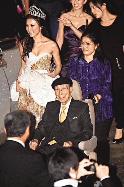 邵逸夫頭戴格仔帽,乘坐銀色豐田Welcab(福祉車)到場,精神奕奕,落車時(shí)帶笑向記者揮手,然后與去年港姐冠軍劉倩婷、亞軍李姿敏、季軍熊穎詩合照,之后邵逸夫由一名護(hù)士推著、6名保安護(hù)送下入場。