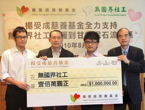 楊受成昨日以“楊受成慈善基金”名義,捐出一百萬(wàn)港元予無(wú)國(guó)界社工。無(wú)國(guó)界社工將派出五名義工于本周五或以前到災(zāi)區(qū)視察災(zāi)情,并安排該一百萬(wàn)元善款購(gòu)買災(zāi)民目前最需要的物資,例如一般生活必需品等。首批物資最快可于本月二十日送到災(zāi)民手中。