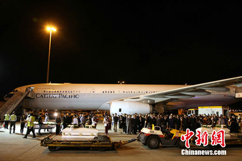 中新社香港8月25日電(梁今 胡娜 梁君艷)在菲律賓劫持人質(zhì)事件中八位香港遇難者的靈柩,25日晚由港府包機(jī)從馬尼拉送返香港。