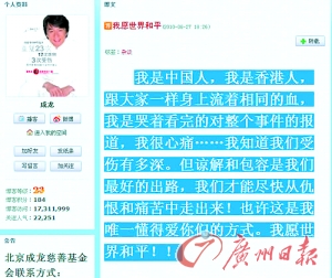 娛樂圈新人周柏豪則說:“我不評論前輩。成龍大哥出來講對不起,證明他很關(guān)注這宗慘劇,我相信每一個香港人都是關(guān)心所有受害者及家屬的,也相信成龍能幫上忙的話肯定會幫。”