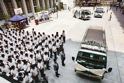 3輛靈車中午抵達(dá)梁錦榮母校天主教伍華中學(xué),約300名師生及校友齊向3人告別,全場默哀1分鐘。校內(nèi)響起下課鐘聲,象征梁錦榮已走完了人生路程,可以下課。校方播放校歌的純音樂版本,由3名學(xué)生代表向靈車三鞠躬。此時,坐在帳篷內(nèi)的梁太終忍不住,低頭落淚。整個儀式歷時約15分鐘。靈車駛離校園時,在場人士向靈車揮手作別,神情哀傷。