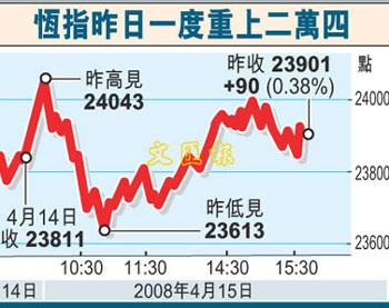 中新網(wǎng)4月16日電 據(jù)香港文匯報(bào)報(bào)道,大市缺乏方向,港股表現(xiàn)反復(fù)。15日大市高開(kāi)139點(diǎn)后,一度重上24000點(diǎn)關(guān)口,但其后在高位沽壓顯著增加,恒指收市升90點(diǎn)至23901點(diǎn),成交縮減至714.5億元。分析員指,大市仍未能突破250天線(xiàn),料短期內(nèi)大市仍在22000-25000點(diǎn)徘徊。