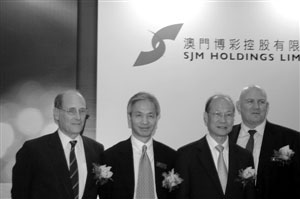 澳門博彩控股行政總裁蘇樹輝、營運(yùn)總裁吳志誠、業(yè)務(wù)發(fā)展總裁麥輝霆、財(cái)務(wù)總監(jiān)麥文彬25日在香港香格里拉酒店介紹上市程序。