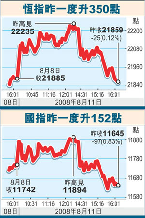中新網(wǎng)8月12日電 據(jù)香港文匯報報道,受隔夜美股造好及內地股市大挫影響,港股11日先升后跌,大市開市高開135點,但午市受A股大跌逾5%影響,收市倒跌25.87點,收報21859.34點,成交總額僅575.90億元。市場人士指,市場關注內地的通脹數(shù)據(jù),港股后市料反復,恒指或下試21500點。