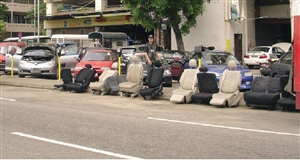 將座椅地氈?jǐn)[車頂、路邊,成修車行一帶新景觀。(圖片來(lái)源:澳門日?qǐng)?bào))