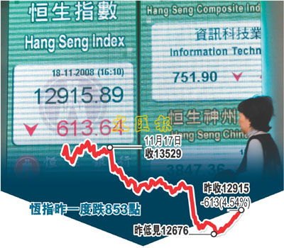 美國(guó)就業(yè)市場(chǎng)憂慮加深,美股跌223點(diǎn),令18日外圍股市也全線偏軟,連內(nèi)地上海A股也要急挫6.3%,港股低開(kāi)231點(diǎn)后持續(xù)下跌,下午恒指隨A股弱勢(shì)曾經(jīng)跌超過(guò)850點(diǎn),低見(jiàn)12676點(diǎn),尾市跌幅略為收窄,但仍守不住13000點(diǎn)大關(guān),恒指全日收12915.8點(diǎn),跌613.6點(diǎn),成交448億元。