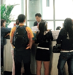 受影響旅客在亞洲航空公司柜位查詢航班情況。(圖片來源:澳門日報(bào))