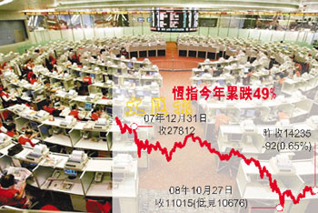 恒指30日收報14235點(diǎn),今年以來計(jì),跌幅達(dá)49%或13600點(diǎn),以點(diǎn)數(shù)計(jì)是歷年最大,以百分比計(jì)是歷年第二大。受環(huán)球金融海嘯拖累,年內(nèi)市況極為動蕩,連強(qiáng)積金也大虧,無論大戶散戶,也不論有否投資股票,人人損失慘重。