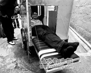 記者在策展人鐘宏亮引領(lǐng)下參觀了整個展覽,發(fā)現(xiàn)了不少充滿新意的作品。在女子監(jiān)獄外的名為《工作/空間/再工作/時間》的作品儼然一棟房子,但全部由一塊塊黑色薄木板拼建成,透過木板間的間隙可以看到建筑里的人在活動,而整個建筑又相當(dāng)結(jié)實(shí),人可以從“樓梯”登上房子的二樓。名為《流浪家居》的作品,作者甚至設(shè)計(jì)了一輛“房車”,不過是流浪者的“房車”,由自行車帶動,“房車”麻雀雖小,五臟俱全,里面有窗有門,有柜子有凳子,通過拼接還可以組成一張床,作者現(xiàn)場向大家講解時還興奮地拼起床躺了下來。(馮悅)