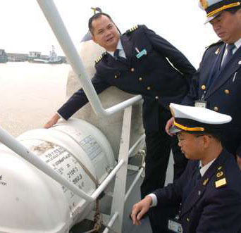 圖:廣東海事局工作人員在珠海九洲港檢查來往港澳的高速客船。
