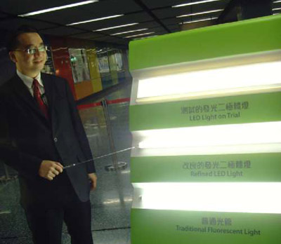 港鐵去年初耗資四百萬(wàn)港元,在港島、荃灣及將軍澳三趟市區(qū)地鐵列車進(jìn)行車廂LED環(huán)保燈測(cè)試計(jì)劃,港鐵總結(jié)稱,測(cè)試收到良好效果,除能有效節(jié)省能源外,LED燈的壽命較傳統(tǒng)光管耐用高四倍,達(dá)五萬(wàn)小時(shí),且更換時(shí)只需換走芯片便可,不會(huì)釋放水銀和制造光管垃圾。同時(shí)LED光線更接近自然日光,并不會(huì)釋放紫外光,可保護(hù)乘客眼睛,在測(cè)試期間廣為乘客歡迎。
