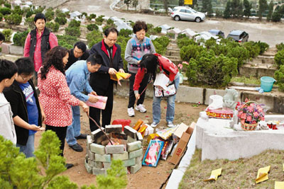 家族成員劉女士表示,祭品總值超過(guò)3000元,除部分洋酒、水果等食物會(huì)帶回家之外,其它諸如“金表”、“西服”等紙?jiān)榔范紩?huì)在拜祭后燒給先人使用。她表示,潮汕人對(duì)傳統(tǒng)祭祀習(xí)俗非常重視,一年一次的拜祭先人一定是召集全家族齊出動(dòng)。她又說(shuō):“年年祭祖,只有今年乳豬、燒雞、水果等祭品是雙份的,就連跪拜用的洋酒也帶了兩瓶?傊,大家的生活漸好,荷包也比往年漲一些,當(dāng)然也希望祖先吃好過(guò)好。”家中最小成員趙同學(xué)說(shuō),自己專門準(zhǔn)備了黃菊花和百合獻(xiàn)給外公,“我今年是第一次來(lái)祭掃,還真沒(méi)見(jiàn)過(guò)這么隆重的祭祀場(chǎng)面!