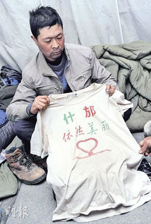 “眼看手勿動!”記者欲一睹黃福榮日記,男子立即阻止:“不行,我要將黃大哥的日記,親手交給他的家人!笔殖秩沼浀慕欣顦渲,是內(nèi)地一家社福機構(gòu)的救災(zāi)義工,與阿福結(jié)緣于汶川地震,“我不單有黃大哥的日記,還有他在災(zāi)區(qū)穿過的T恤”。