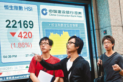 中新網(wǎng)10月28日電 據(jù)香港《文匯報(bào)》報(bào)道,外圍股市跌,拖累港股在臨近期指結(jié)算前急挫,恒指27日隨美股疲軟而低開573點(diǎn),其后跌幅一度收窄至不足400點(diǎn),但午后內(nèi)地股市“插水”,大跌近3%,恒指下午再一輪下跌,結(jié)果全日跌420點(diǎn),收報(bào)22169.5點(diǎn),跌1.86%,是三周以來最大跌幅,港股成交額739億元。