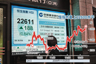 中新網(wǎng)11月26日電 據(jù)香港《文匯報(bào)》報(bào)道,內(nèi)地A、B股齊反彈,帶動(dòng)恒指25日回升,但升幅遠(yuǎn)比內(nèi)地股市小。上證A股25日反彈1.9%,上證B股更升5.1%,帶動(dòng)恒指先跌后回升,全日收?qǐng)?bào)22611.8點(diǎn),升188.6點(diǎn),升幅不夠1%,但成交增至787億元。